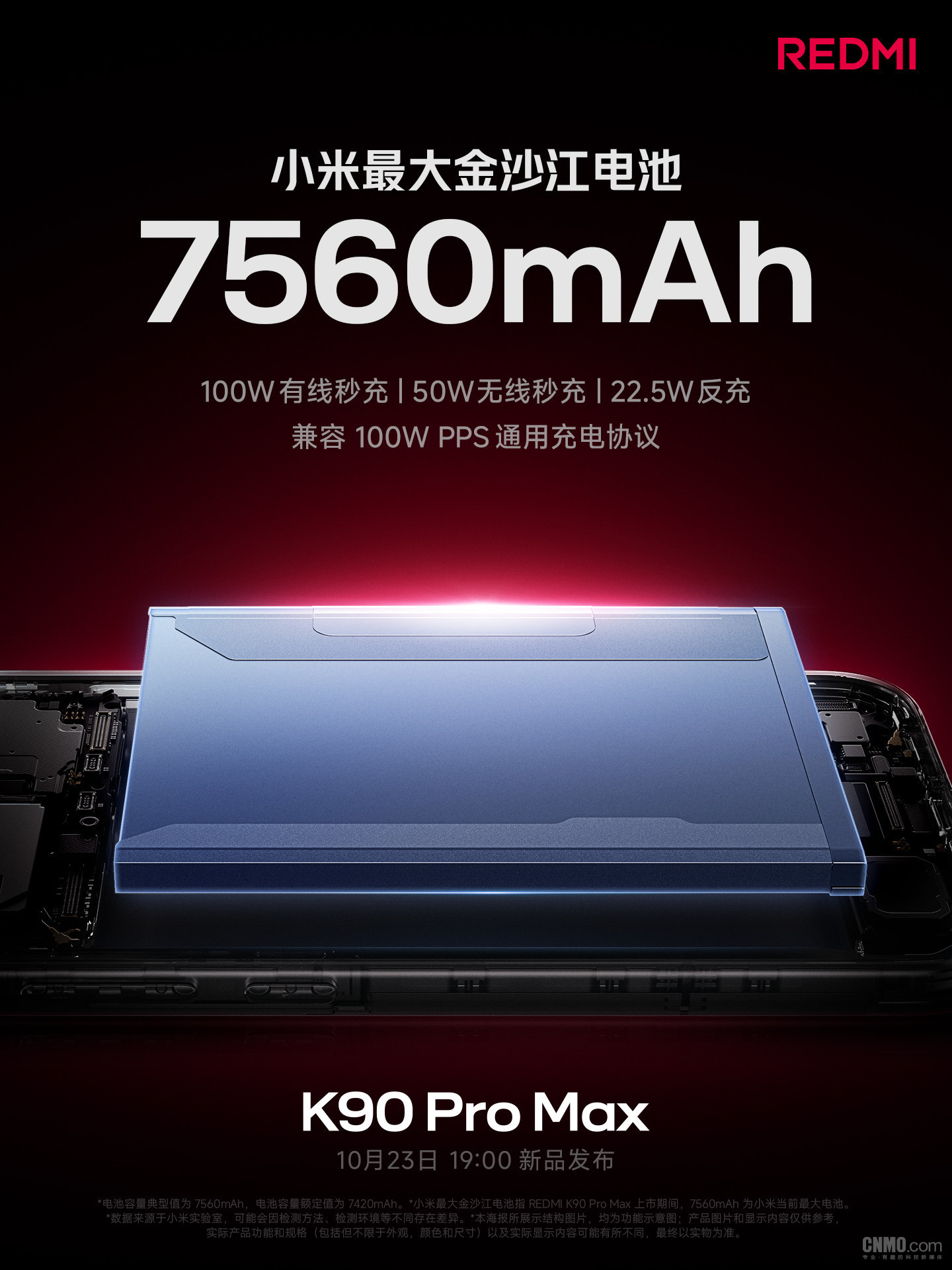 【CNMO科技消息】10月20日,REDMI手机官方公布了K90 Pro Max的续航配置。新机将配备7560mAh小米金沙江电池,支持100W有线秒充、50W无线秒充和22.5W反充,并全面兼容100W PPS通用充电协议。作为参考,REDMI K80 Pro的电池容量为6000mAh,充电功率为120W(有线)和50W(无线)。